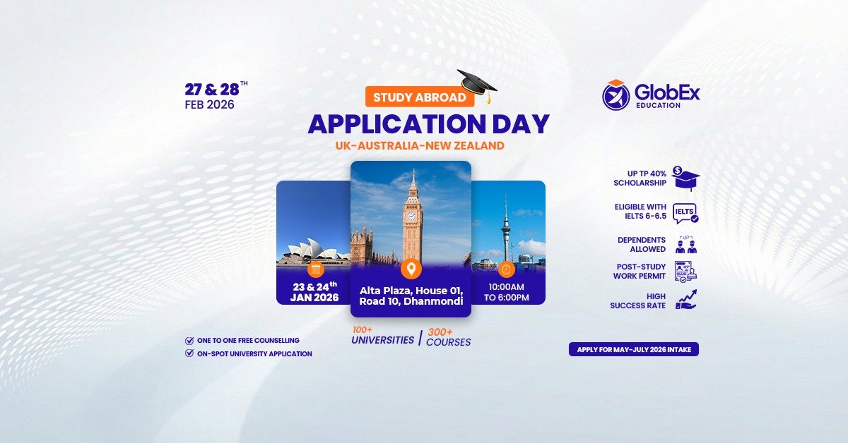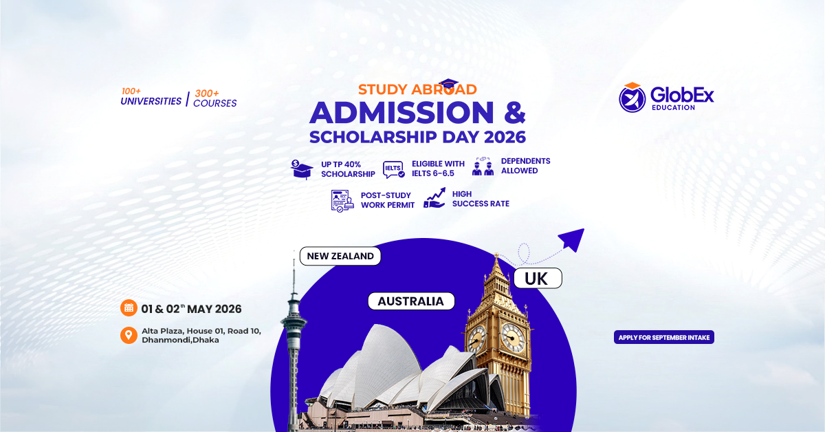 GlobEx Education partners with 200+ universities in the UK, Australia and New Zealand, guiding Bangladeshi students through every step of their study-abroad journey. We assist with course & university selection, scholarship & funding guidance, English test & interview preparation, documentation, applications, visas, and pre & post-departure support to make your higher study dreams come true smoothly.