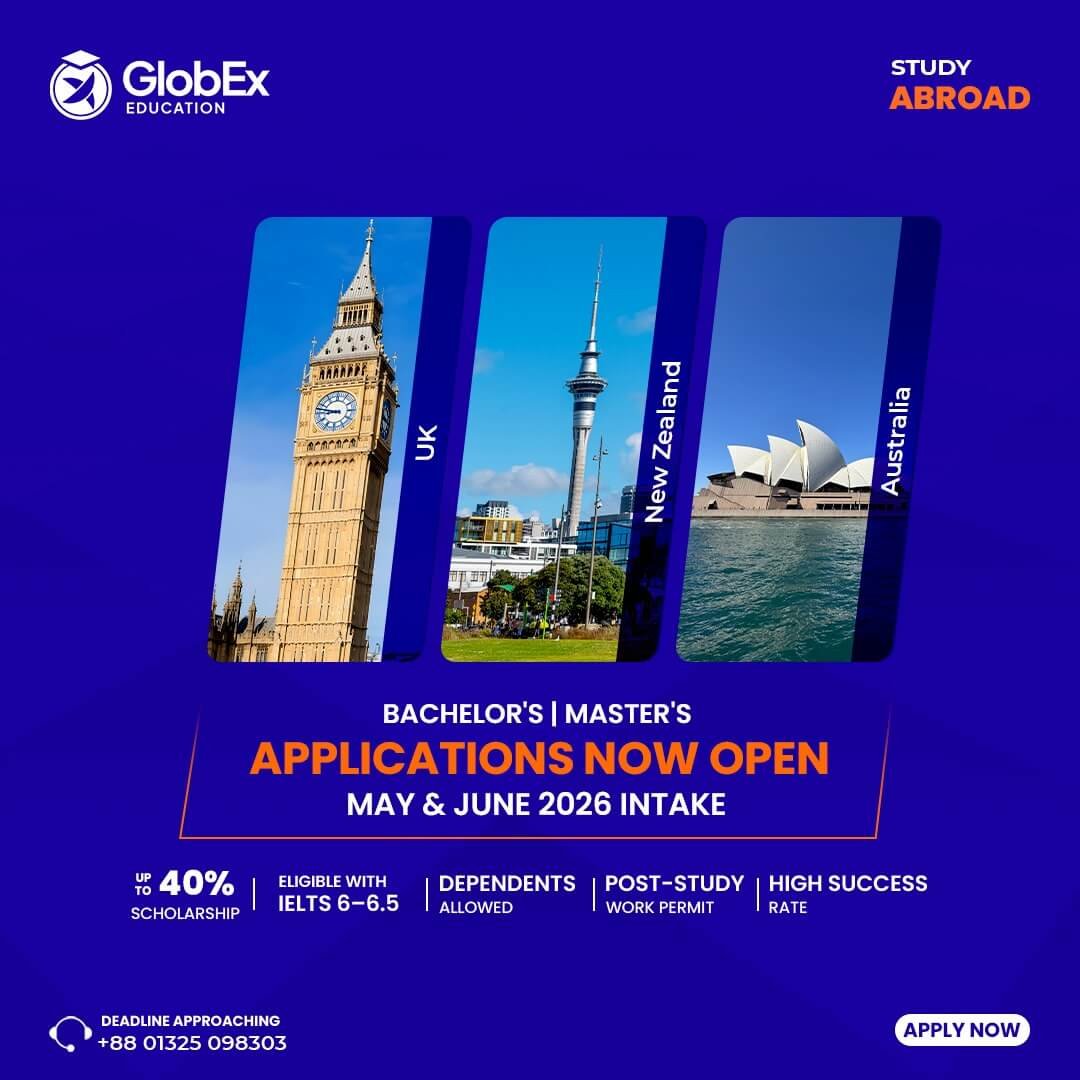 🔻 GlobEx Education partners with 200+ universities in the UK, Australia & New Zealand, supporting Bangladeshi students throughout their study-abroad journey — course & university selection to application & visa processing, with pre & post-departure guidance.